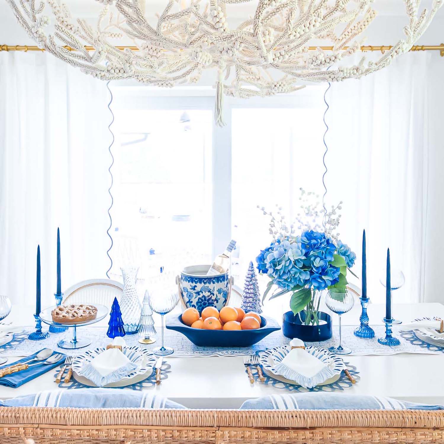A blue and white Christmas tablescape is the perfect way to add a touch of coastal elegance to your holiday season. This tablescape features a coastal blue, navy and white color palette, with chinoiserie accents.